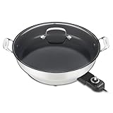 One of the most versatile countertop cooking appliances available, this electric skillet provides a round, 14-by-14-inch cooking surface with over 150 square inches of space for everything from family orders of pancakes to fajitas with friends. The thoughtfully designed skillet features a petroleum-free, ceramic-based, nonstick cooking surface that contains no PTFE or PFOA, which means less impact on the environment, while offering healthier cooking options (little to no butter or oil needed) and effortless food release. For convenient monitoring of food while cooking, the attractive appliance includes a tempered glass lid with a stainless-steel rim and handle. In addition, die-cast stainless-steel handles flanking both ends feature an embossed Cuisinart logo and provide a safe, secure grip when transporting the skillet from the kitchen to the dining-room table for serving. The unit's temperature control dial with a handy indicator light can be adjusted from "warm" to 450 degrees F and removes easily for cleanup by hand or in the dishwasher. An instruction/recipe booklet with over 30 recipes comes included. Beautifully housed in polished stainless steel, the 1800-watt electric skillet measures 17-1/5 by 18-1/5 by 7-2/7 inches and carries a three-year limited warranty.