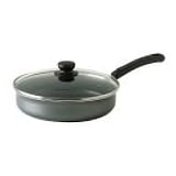 (More customer reviews)The hard-anodized coating works perfectly as a non-stick and rugged finish. The steep, somewhat tall, sides reduce spattering and the lid allows steaming/frying such things as apples. I am very pleased with this product and highly recommend it.