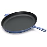 (More customer reviews)This is a hybrid pan-a cross between a griddle and a skillet.It fits perfectly on my stovetop bridge burner and has the added bonus of having 1 1/2" sides so deglazing works perfectly.I just use it as an extra large skillet and only have to use low to medium heat.All Le Creuset looks beautiful on the table so serving in this pan looks great.Cleaning is a breeze--just let it cool, soak for a short periiod of time and everything wipes off easily!When recipes work better with heavier cookware, Le Creuset is my choice--I have many pieces (different colors!) and really enjoy using all of them.(All-Clad is my choice for other duties...)If heavy pans are not an issue for you, try Le Creuset!
