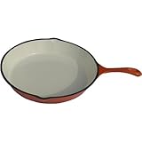 Enamel Coated Cast Iron 12 Inch Skillet. Inside diameter 11 3/4 inches. Outside diameter 12 inches. Depth 1 3/4 inches. Overall length 17 inches. Reddish-orange in color. 12 Inch Skillet. Cast Iron. Enamel Coated