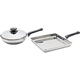 Surgical stainless set comes with riveted polypropylene handles and mirror polishing for beauty.Includes:11"X11" griddle and 9/12" skillet with steam control over.