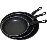 Set of 3 carbon steel frypans includes a 8, 10 and 12 inch fry pan coated with Xylan non stick. Stay cool phenolic handles with flame guard. Gradual sizes for all your kitchen needs.