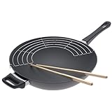 This Stir Fry pan has a thick base, which allows you to cook your food in an evenly heated pan with less heat than a thinner base would permit. Other features include a heat-resistant handle, and a nonstick Ceramic Titanium interior surface that is safe for use with metal utensils and won't crack, peel, or blister. The Stir Fry pan is oven-safe to 500 degrees. This also includes a rack and chopsticks.