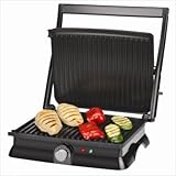 Ideal for summertime grilling any time of year, this indoor countertop contact grill and panini maker features a generous four-slice cooking surface that can accommodate meals for both couples and small-size families. Grill anything from hamburgers, salmon fillets, and marinated tofu to slices of eggplant, summer squash, peppers, and more. The unit's ribbed surface sears those tasty grill marks into food, while raising food up and away from excess grease and oil, channeling it down and away from food for healthier results. For added convenience, the appliance comes equipped with a floating hinge that automatically adjusts to evenly cook thick items like panini sandwiches loaded with extra layers of veggies and cheese. The grill can also be opened all the way for twice the amount of flat cooking surface, and a high-quality nonstick coating on both its plates helps ensure lower fat cooking (no need for excess butter or oil), effortless food release, and quick cleanup. Other highlights include "power" and "ready" indicator lights, adjustable temperature control, and a generous handle for raising and lowering the lid. A nice choice for at home or to take along to the beach house or cabin, the 1400-watt contact grill and panini maker measures 12-3/4 by 13-1/4 by 5 inches and carries a one-year limited warranty.