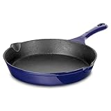 High quality enamel coating cast iron 10 Inch Blue Fry Pan with black matte interior.Suitable for all heat sources and features even heat distribution and retention.Oven safe up to 450° F.